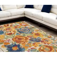Ivory and Blue Abstract Hand Knotted Worn Faded Area Rug