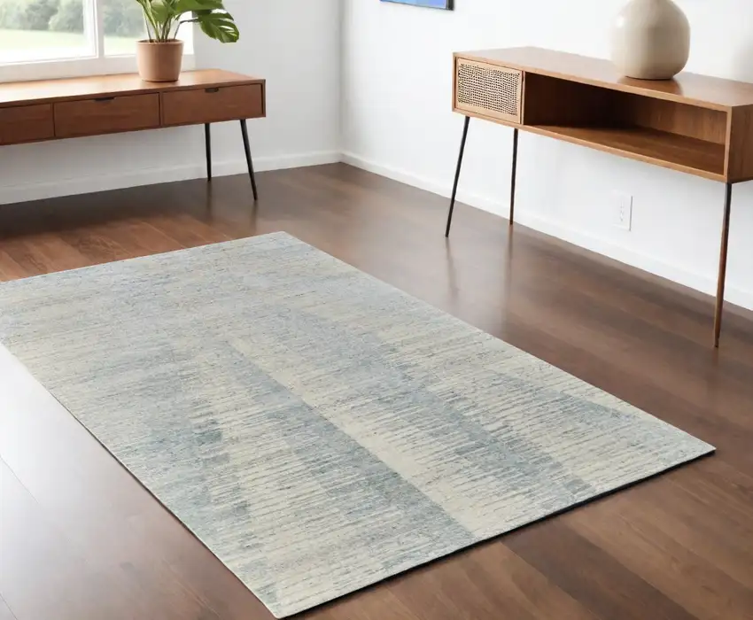 Add great coloration and comfortable texture to your space with this 4-foot x 6-foot ivory and blue abstract hand knotted worn faded area rug. This rectangle shaped rug features a abstract design in ivory and blue to give it visual interest. A classic shape marries with good looking design for your space crafted by skilled artisans, this hand knotted rug is genuine and unique. No two will be exactly alike. Area rugs help to give warmth and sense of home to your space. 48-inch H x 72-inch W x 0.31-inch D