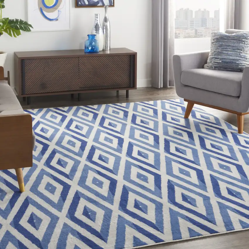 Ivory and Blue Geometric Distressed Non Skid Area Rug