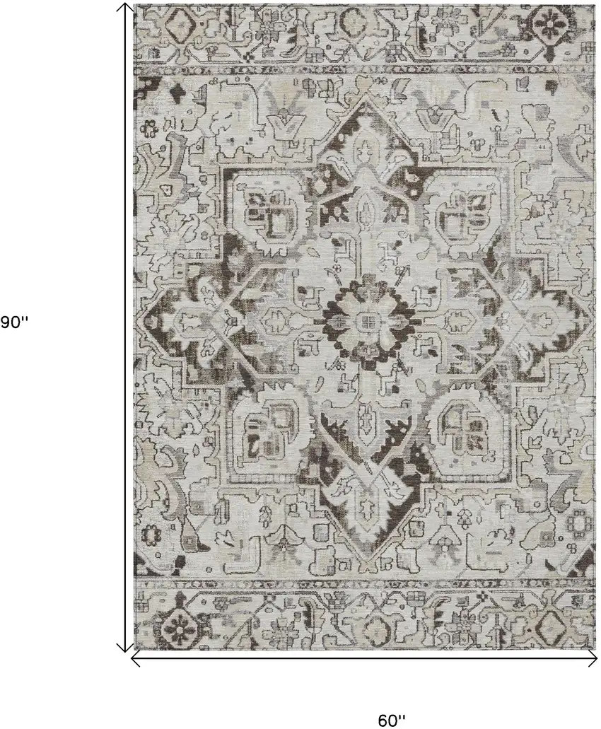 Add great coloration and comfortable texture to your space with this 5-foot x 8-foot ivory and dark brown oriental washable stain resistant non skid indoor outdoor area rug. This rectangle shaped rug features a oriental design in ivory and dark brown to give it visual interest. A classic shape marries with good looking design for your space ideal for spaces with kids and pets, this rug is stain resistant to help repel stains and spilled liquids. Place this area rug against a hardwood or tile floor and it will enliven your living space with style and sophistication. 60-inch H x 90-inch W x 0.19-inch D