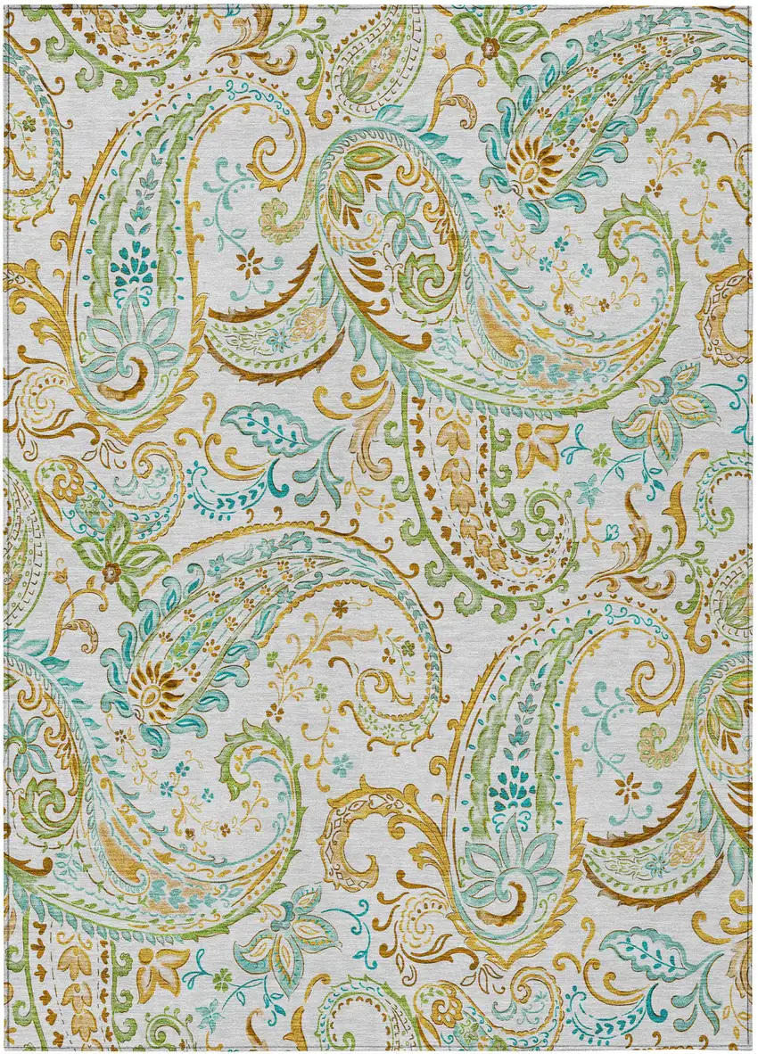 Add some artistry to your room with this 10-foot x 14-foot ivory and gold paisley washable stain resistant non skid indoor outdoor area rug. This rectangle shaped rug features a paisley design in ivory and gold to give it visual interest. A classic shape marries with good looking design for your space ideal for spaces with kids and pets, this rug is stain resistant to help repel stains and spilled liquids. Place this area rug against a hardwood or tile floor and it will enliven your living space with style and sophistication. 120-inch H x 168-inch W x 0.19-inch D