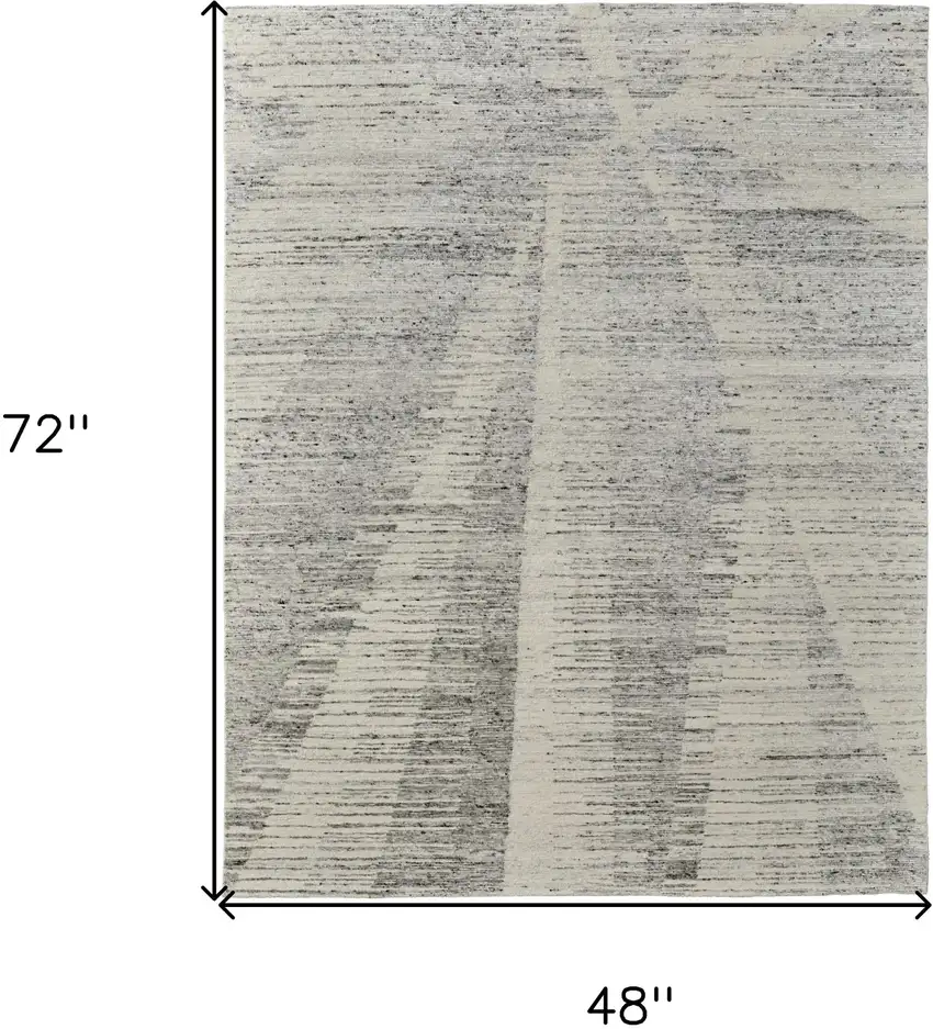 Add some artistry to your room with this 4-foot x 6-foot ivory and gray abstract hand knotted worn faded area rug. This rectangle shaped rug features a abstract design in ivory and gray to give it visual interest. A classic shape marries with good looking design for your space crafted by skilled artisans, this hand knotted rug is genuine and unique. No two will be exactly alike. Place this area rug against a hardwood or tile floor and it will enliven your living space with style and sophistication. 48-inch H x 72-inch W x 0.31-inch D