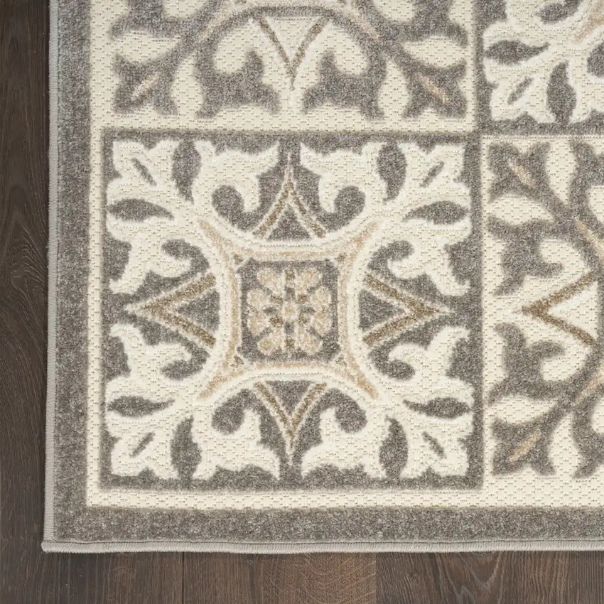 Decorate your homes with this stain-resistant, non-skid rug, boasting an intricate fleur-de-lis pattern in soothing ivory and grey tones. Besides adding visual interest, the rug offers functional advantages like easy-care and durability.