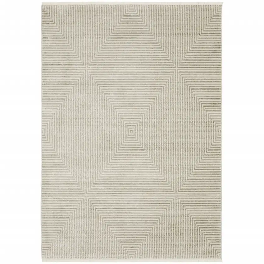 Ivory Beige Taupe And Tan Geometric Power Loom Stain Resistant Area Rug With Fringe