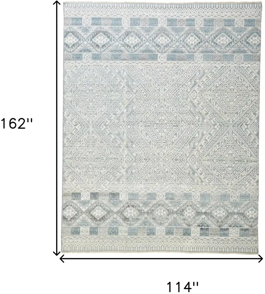 This stunning area rug features carefully hand-knotted craftsmanship, making each piece unique. The complex geometric patterns provide an artful blend of ivory, blue and gray.