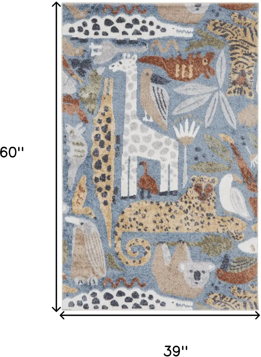 Ivory Blue and Gray Kids Safar Animal Print Washable Area Rug