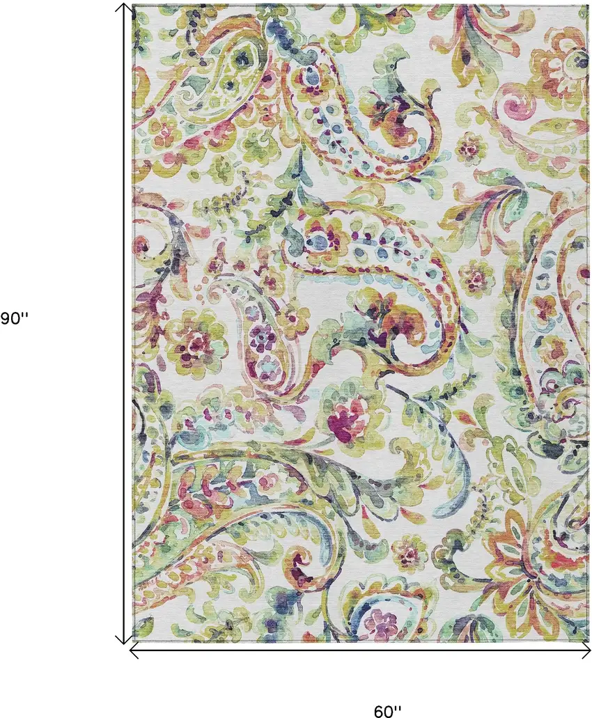 Add great coloration and comfortable texture to your space with this 5-foot x 8-foot ivory fern green and artichoke green paisley washable indoor outdoor area rug. This rectangle shaped rug features a paisley design that will work well both indoors or out. A classic shape marries with good looking design for your living room, hall, bedroom, porch, patio, or poolside. Ideal for outdoor spaces or high traffic areas with kids and pets, this rug is made from heavy duty polyester that is stain resistant to help repel water, dirt, and stains. Versatile in use, durable, and easy to maintain, this rug is an ideal solution to add a decorative and inviting touch to your indoor or outdoor space. 60-inch h x 90-inch w x 0.19-inch d.