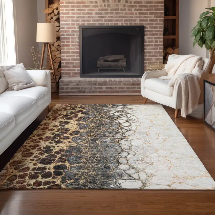 Ivory Gray And Gold Abstract Washable Indoor Outdoor Area Rug