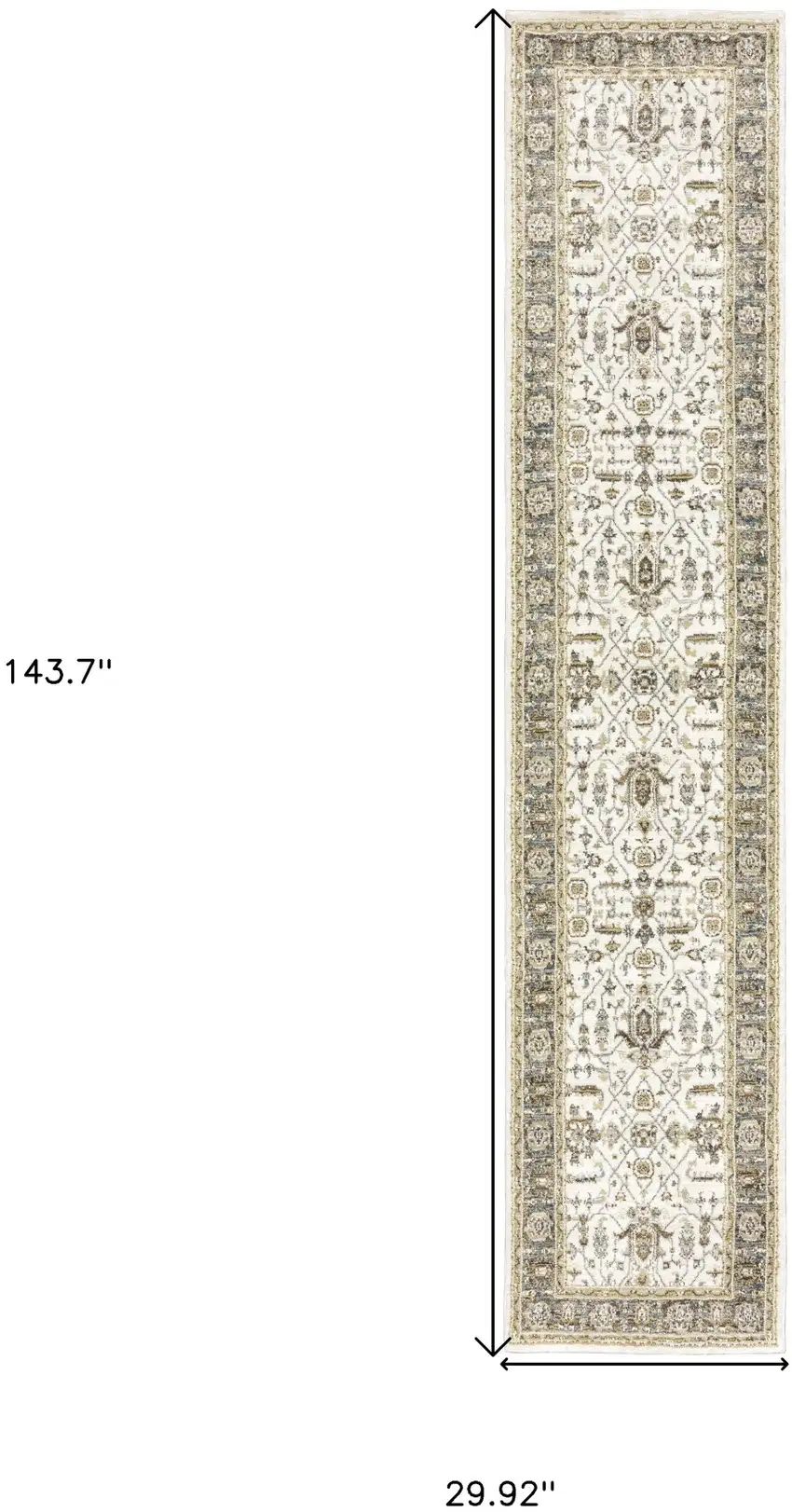 Ivory Grey And Blue Oriental Power Loom Stain Resistant Runner Rug