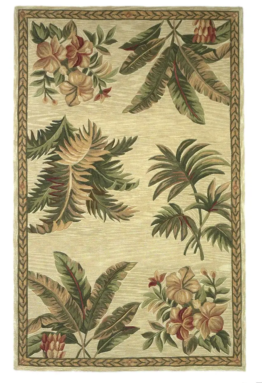 Ivory Hand Tufted Bordered Tropical Plants Indoor Area Rug