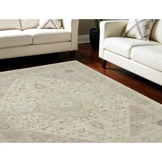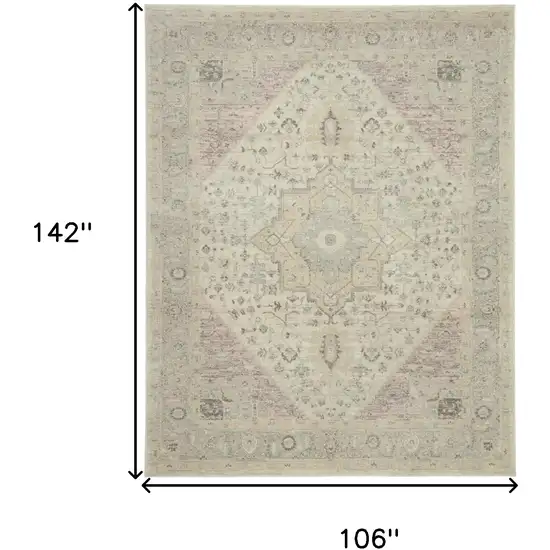 Add some artistry to your room with this 9-foot x 12-foot ivory pink and gray floral medallion distressed area rug. Ideal for spaces with kids and pets, this rug is stain resistant to help repel dirt and spilled liquids. Built to last, this rug crafted from polypropylene fibers is known for its durability and long lasting appeal. Rugs are a great way to showcase your style, hide imperfections, warm your home and reduce noise. This larger sized, transitional styled rug is ready to create a focal point or statement piece in your room. 106-inch h x 142-inch w x 0.5-inch d.