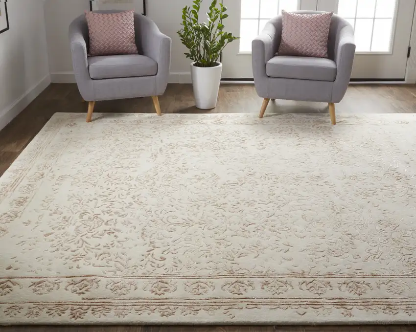 This stunning area rug boasts a floral design handcrafted using a wool tufting technique, adding a warm and artistic touch to any space. It brings a touch of elevated elegance with its ivory, tan, and pink hues.