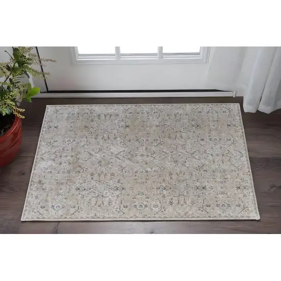 This 2-foot x 3-foot ivory taupe and blue abstract power loom worn faded area rug with fringe, is a great way to add warmth to a room. This rectangle shaped rug features a abstract design in ivory taupe and blue to give it visual interest. A classic shape marries with good looking design for your space ideal for spaces with kids and pets, this rug is stain resistant to help repel stains and spilled liquids. Tassel ends bring a timeless and fashionable look to your interior. Place this area rug against a hardwood or tile floor and it will enliven your living space with style and sophistication. 24-inch H x 36-inch W x 0.43-inch D