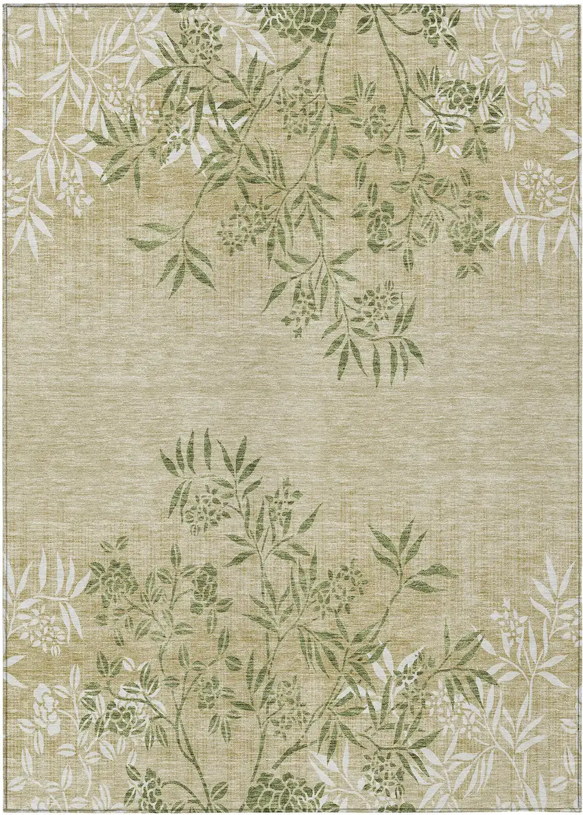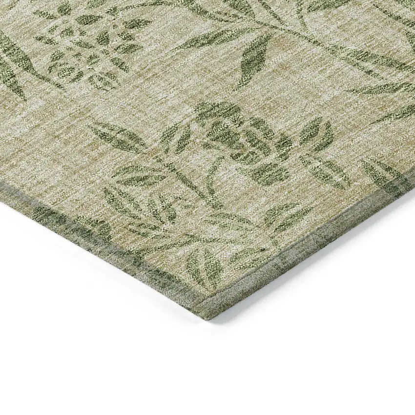 Khaki Ivory And Green Floral Washable Indoor Outdoor Area Rug