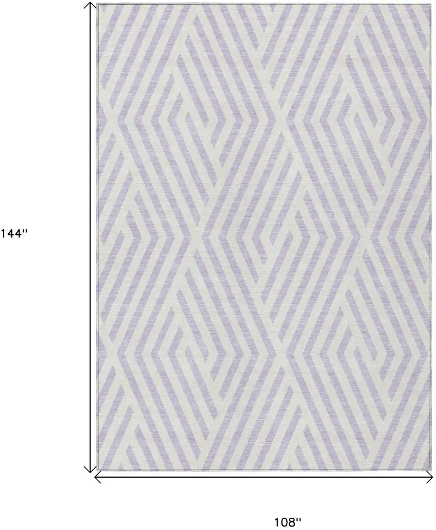 Add great coloration and comfortable texture to your space with this 9-foot x 12-foot lavender and ivory geometric washable stain resistant non skid indoor outdoor area rug. This rectangle shaped rug features a geometric design in lavender and ivory to give it visual interest. A classic shape marries with good looking design for your space ideal for spaces with kids and pets, this rug is stain resistant to help repel stains and spilled liquids. Area rugs help to give warmth and sense of home to your space. 108-inch H x 144-inch W x 0.19-inch D