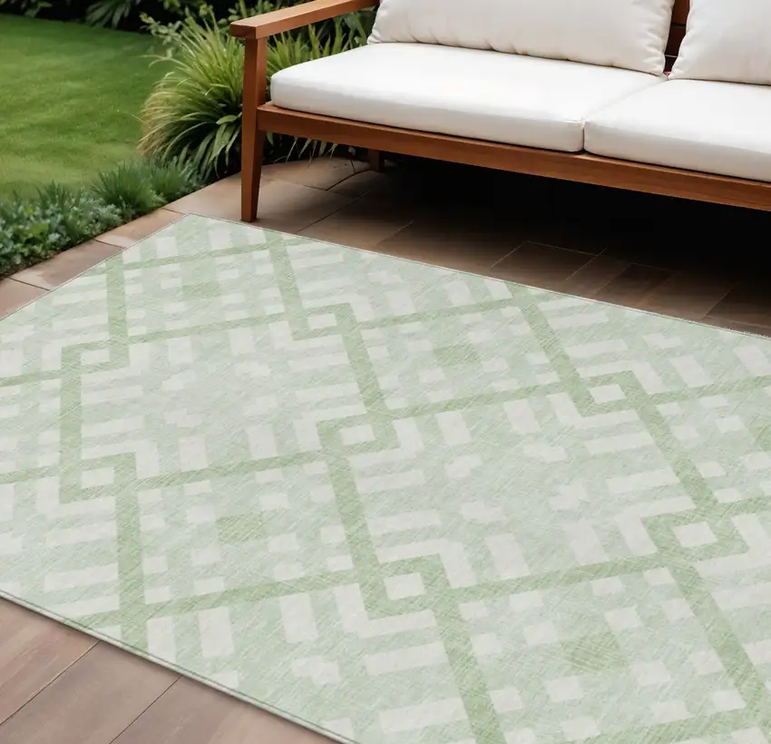 Add some artistry to your room with this 9-foot x 12-foot mint green and ivory geometric washable indoor outdoor area rug. This rectangle shaped rug features a geometric design that will work well both indoors or out. A classic shape marries with good looking design for your living room, hall, bedroom, porch, patio, or poolside. Ideal for outdoor spaces or high traffic areas with kids and pets, this rug is made from heavy duty polyester that is stain resistant to help repel water, dirt, and stains. Makes a great way to dress up your patio, porch, or poolside, but also works well as a durable and easy to maintain option in the kitchen, family room, or mudroom. 108-inch h x 144-inch w x 0.19-inch d.