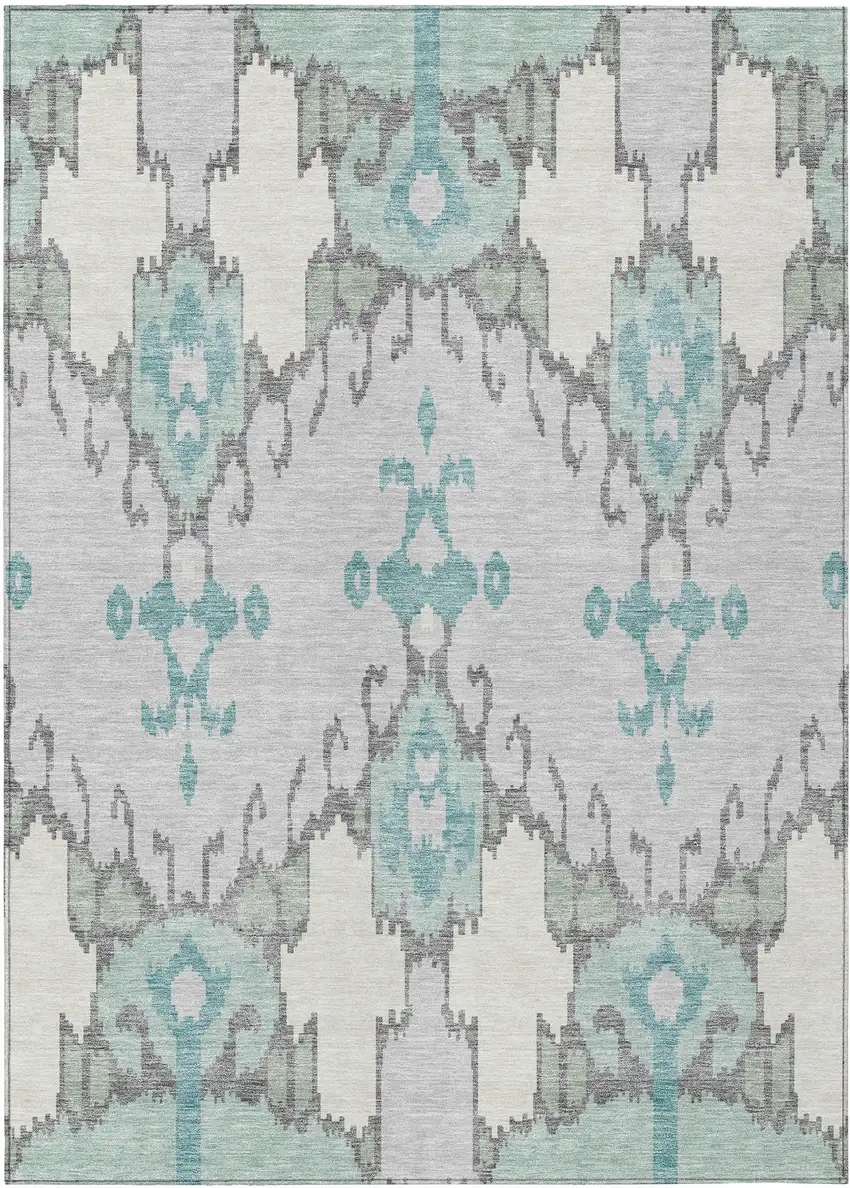 Add some artistry to your room with this 10-foot x 14-foot mint green teal blue and ivory ikat washable indoor outdoor area rug. This rectangle shaped rug features a ikat design that will work well both indoors or out. A classic shape marries with good looking design for your living room, hall, bedroom, porch, patio, or poolside. Ideal for outdoor spaces or high traffic areas with kids and pets, this rug is made from heavy duty polyester that is stain resistant to help repel water, dirt, and stains. Versatile in use, durable, and easy to maintain, this rug is an ideal solution to add a decorative and inviting touch to your indoor or outdoor space. 120-inch h x 168-inch w x 0.19-inch d.
