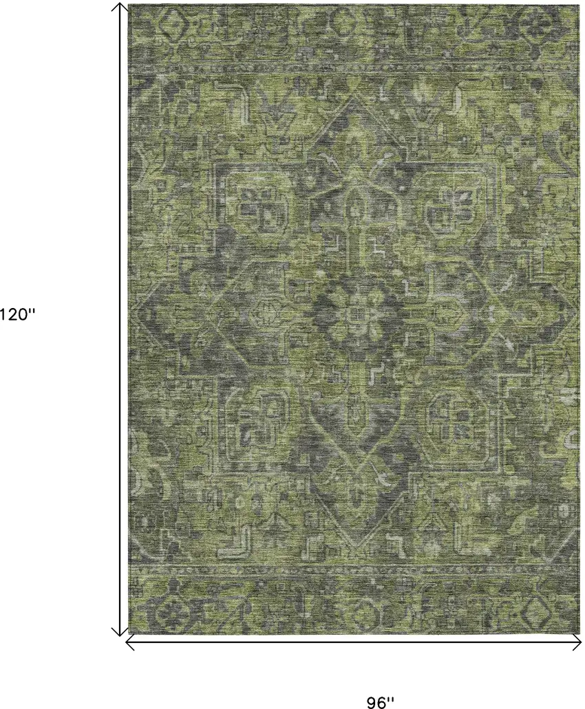 Add great coloration and comfortable texture to your space with this 8-foot x 10-foot moss green and gray oriental washable stain resistant non skid indoor outdoor area rug. This rectangle shaped rug features a oriental design in moss green and gray to give it visual interest. A classic shape marries with good looking design for your space ideal for spaces with kids and pets, this rug is stain resistant to help repel stains and spilled liquids. Place this area rug against a hardwood or tile floor and it will enliven your living space with style and sophistication. 96-inch H x 120-inch W x 0.19-inch D