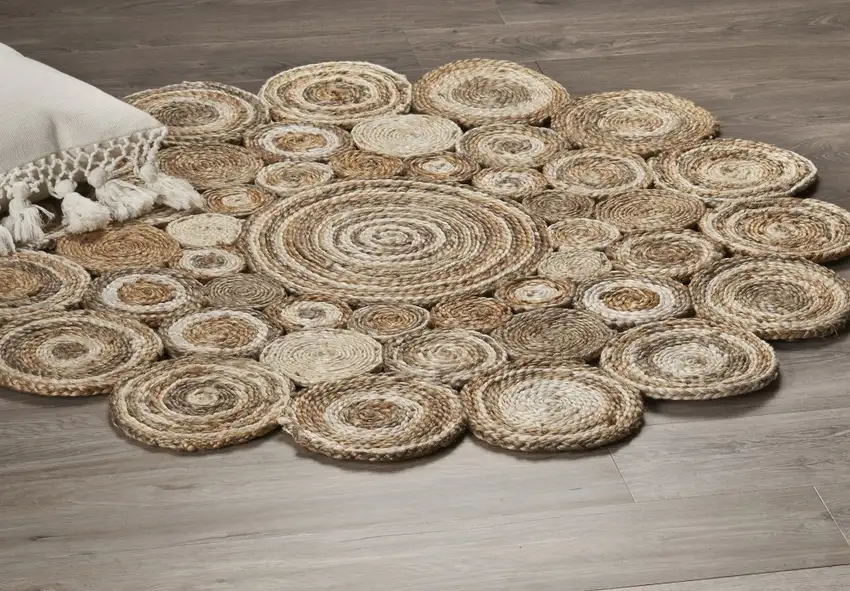 Unveil an exquisite look in your living space with this natural jute area rug featuring multi-toned intricate circle designs. Its organic aesthetic is sure to brighten up your living room and capture admiration.