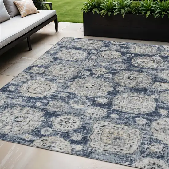 Navy Blue And Gray Floral Washable Indoor Outdoor Area Rug