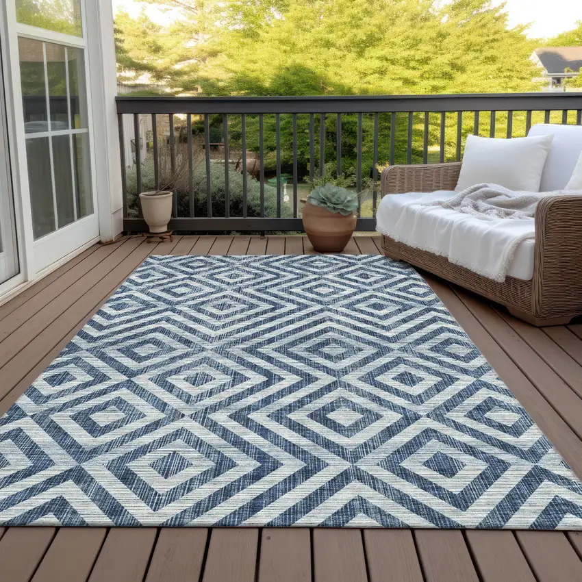 Navy Blue And Ivory Geometric Washable Indoor Outdoor Area Rug