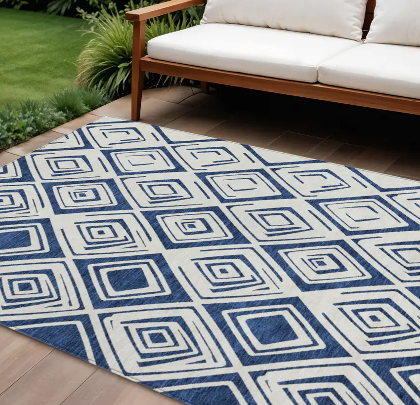 Add some artistry to your room with this 10-foot x 14-foot navy blue and ivory geometric washable indoor outdoor area rug. This rectangle shaped rug features a geometric design that will work well both indoors or out. A classic shape marries with good looking design for your living room, hall, bedroom, porch, patio, or poolside. Ideal for outdoor spaces or high traffic areas with kids and pets, this rug is made from heavy duty polyester that is stain resistant to help repel water, dirt, and stains. Versatile in use, durable, and easy to maintain, this rug is an ideal solution to add a decorative and inviting touch to your indoor or outdoor space. 120-inch h x 168-inch w x 0.19-inch d.