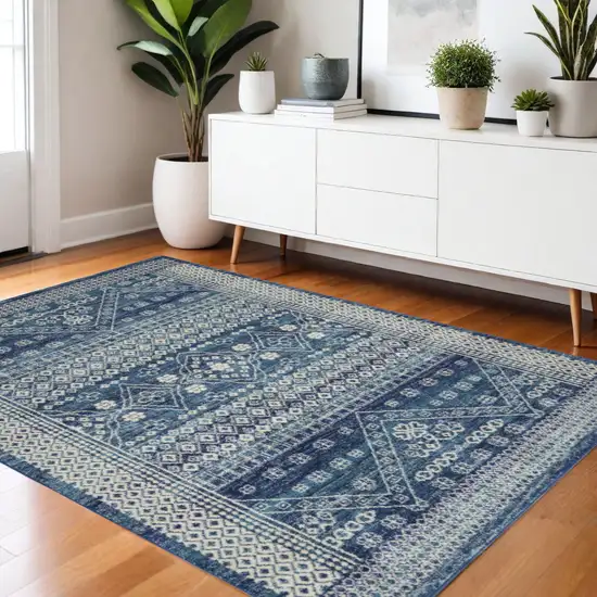 Experience luxury and design with this Persian-inspired rug, adorned with tasteful navy blue and ivory motifs. Its timeless pattern will undoubtedly add a stylish touch to your living space.