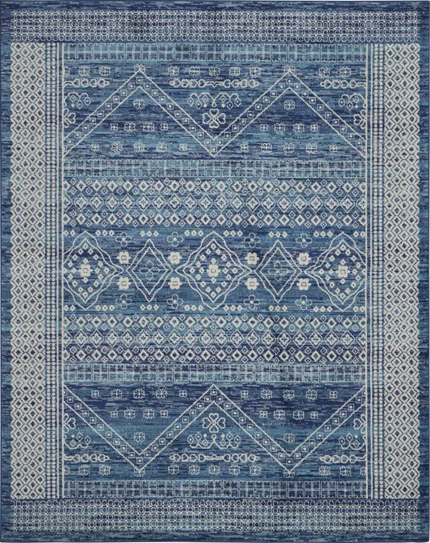 Frame your living space with this elegant blue and ivory rug. Its stunning aesthetic can grab attention and set a sophisticated tone for any room.