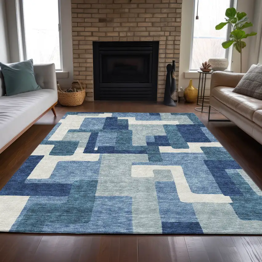 Navy Blue And Sky Blue Abstract Washable Indoor Outdoor Area Rug
