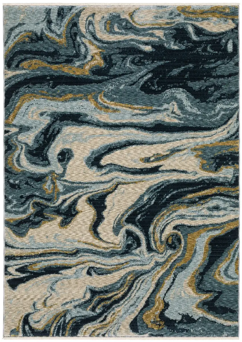 Navy Blue And Teal Abstract Area Rug With Fringe