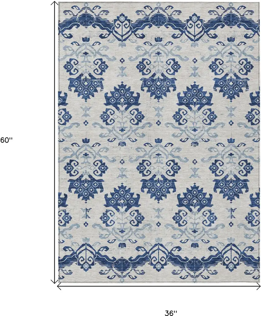 Add some artistry to your room with this 3-foot x 5-foot navy blue beige and denim blue oriental washable indoor outdoor area rug. This rectangle shaped rug features a oriental design that will work well both indoors or out. A classic shape marries with good looking design for your living room, hall, bedroom, porch, patio, or poolside. Ideal for outdoor spaces or high traffic areas with kids and pets, this rug is made from heavy duty polyester that is stain resistant to help repel water, dirt, and stains. Versatile in use, durable, and easy to maintain, this rug is an ideal solution to add a decorative and inviting touch to your indoor or outdoor space. 36-inch h x 60-inch w x 0.19-inch d.