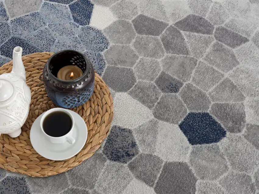 Experience comfort beneath your feet with our plush navy blue rug adorned with a unique cobblestone motif. This rug not only adds warmth to your home but also ensures style and elegance.