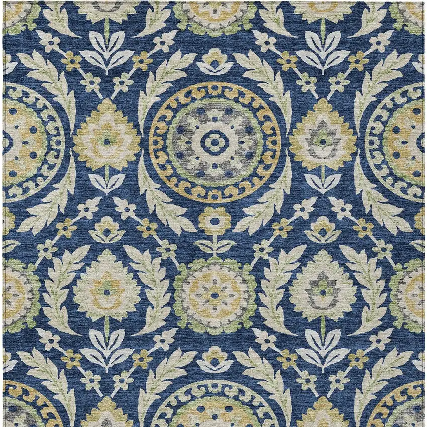 This 8-foot x 10-foot navy blue gold and beige floral washable indoor outdoor area rug, is a great way to add warmth to a room. This rectangle shaped rug features a floral design that will work well both indoors or out. A classic shape marries with good looking design for your living room, hall, bedroom, porch, patio, or poolside. Ideal for outdoor spaces or high traffic areas with kids and pets, this rug is made from heavy duty polyester that is stain resistant to help repel water, dirt, and stains. Versatile in use, durable, and easy to maintain, this rug is an ideal solution to add a decorative and inviting touch to your indoor or outdoor space. 96-inch h x 120-inch w x 0.19-inch d.