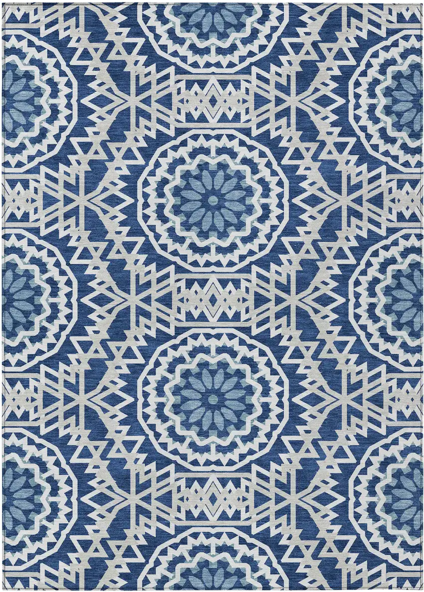 Navy Blue Ivory And Gray Floral Medallion Washable Indoor Outdoor Area Rug