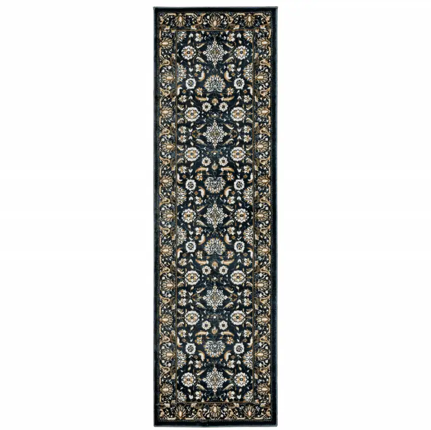 Navy Caramel And Ivory Oriental Power Loom Stain Resistant Runner Rug