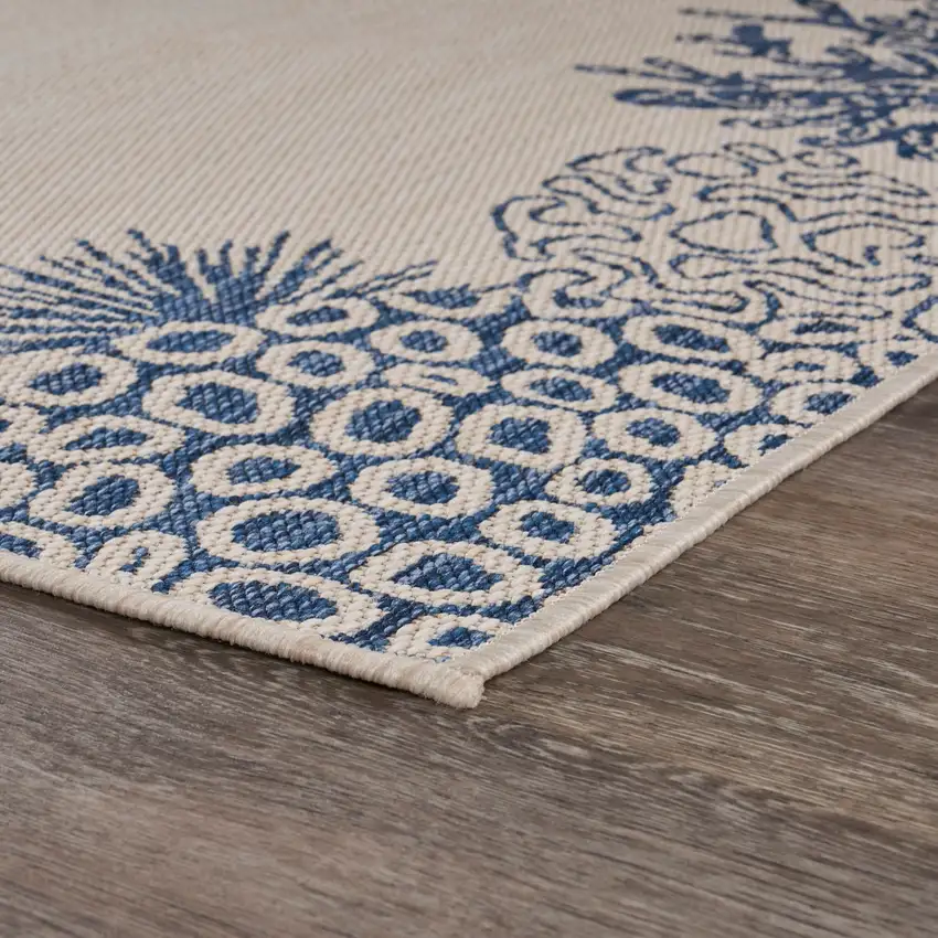 The Navy Reef Border Indoor/Outdoor Area Rug breaks down the barriers between indoor and outdoor living. Enjoy the luxury of this rug in your cozy living room, then take it outside to your patio or deck for an equally captivating experience. Its weather-resistant features ensure that it can withstand the elements, maintaining its beauty and integrity over time.
