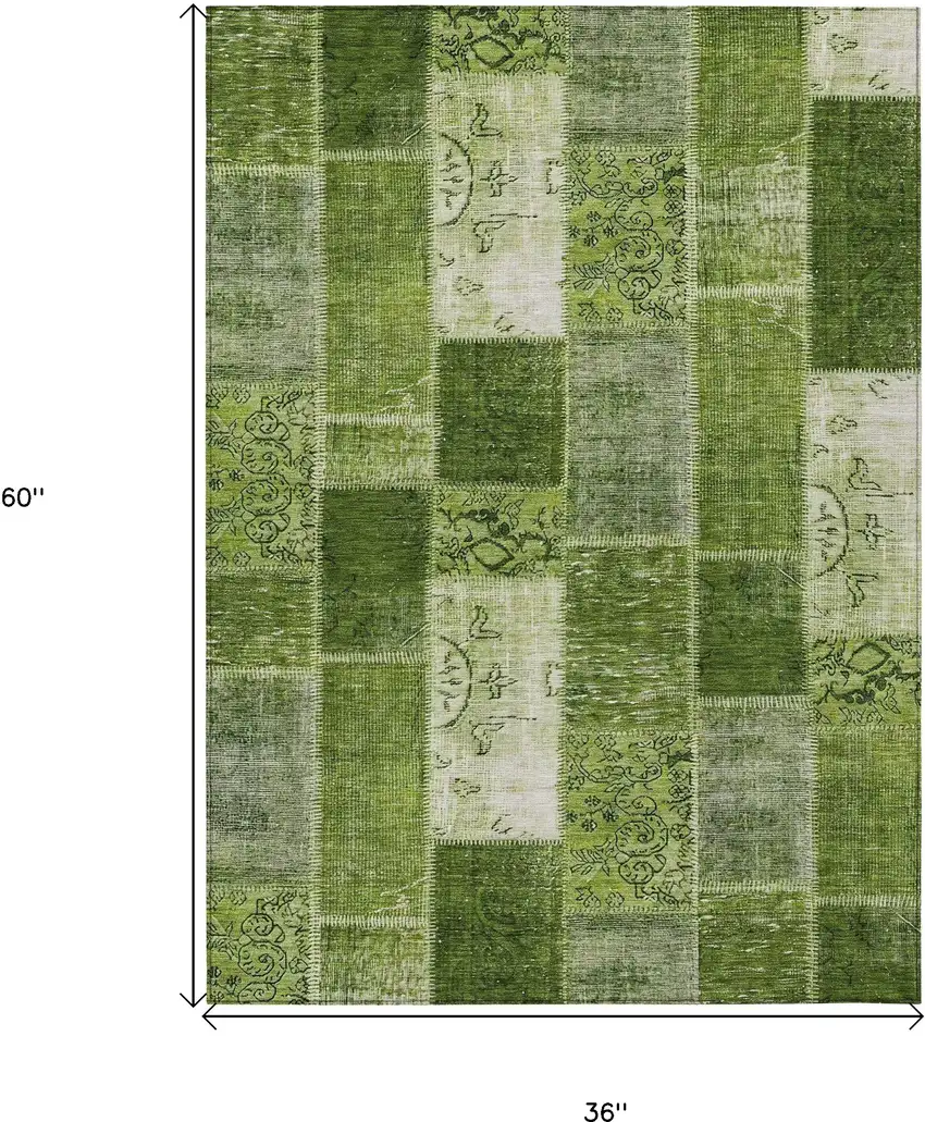 Add some artistry to your room with this 3-foot x 5-foot olive green and artichoke green patchwork washable indoor outdoor area rug. This rectangle shaped rug features a patchwork design that will work well both indoors or out. A classic shape marries with good looking design for your living room, hall, bedroom, porch, patio, or poolside. Ideal for outdoor spaces or high traffic areas with kids and pets, this rug is made from heavy duty polyester that is stain resistant to help repel water, dirt, and stains. Makes a great way to dress up your patio, porch, or poolside, but also works well as a durable and easy to maintain option in the kitchen, family room, or mudroom. 36-inch h x 60-inch w x 0.19-inch d.