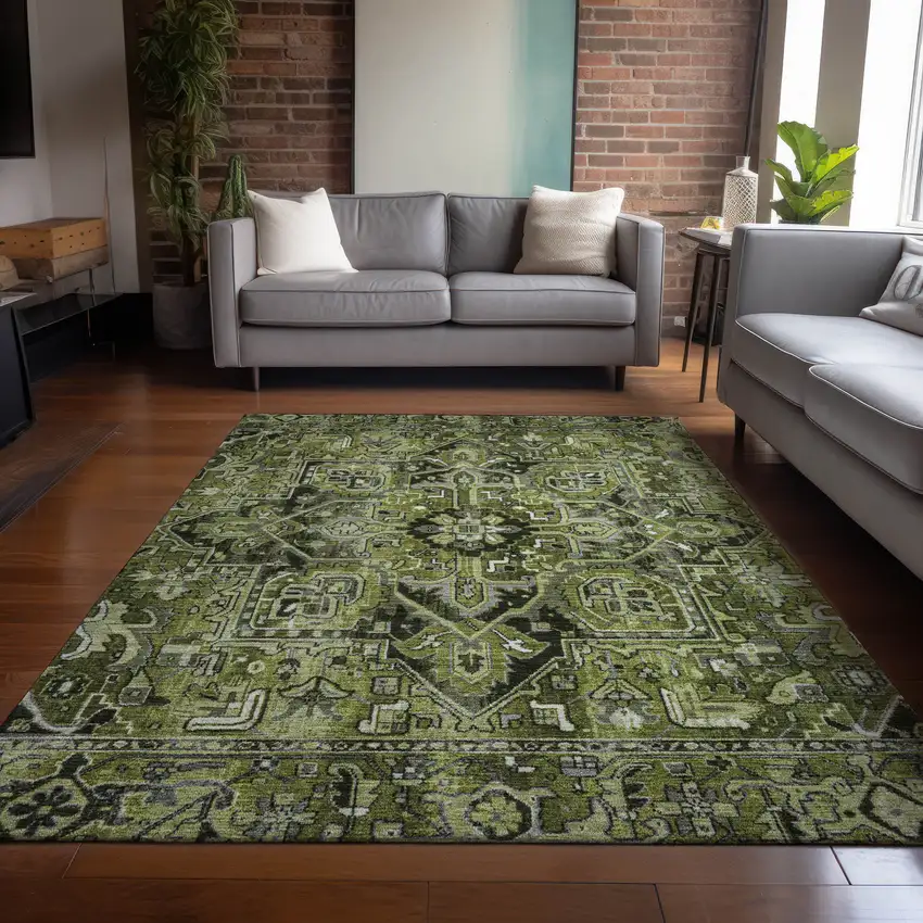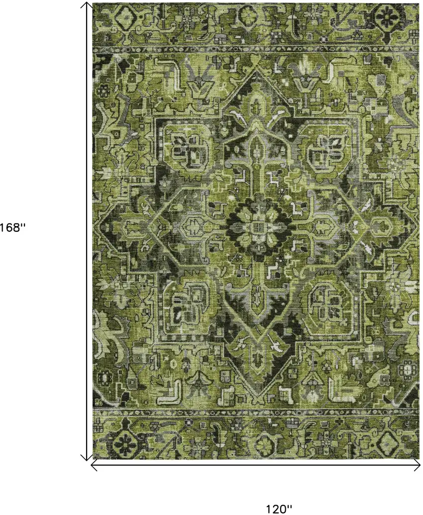 Add great coloration and comfortable texture to your space with this 10-foot x 14-foot olive green and dark green oriental washable stain resistant non skid indoor outdoor area rug. This rectangle shaped rug features a oriental design in olive green and dark green to give it visual interest. A classic shape marries with good looking design for your space ideal for spaces with kids and pets, this rug is stain resistant to help repel stains and spilled liquids. Area rugs help to give warmth and sense of home to your space. 120-inch H x 168-inch W x 0.19-inch D