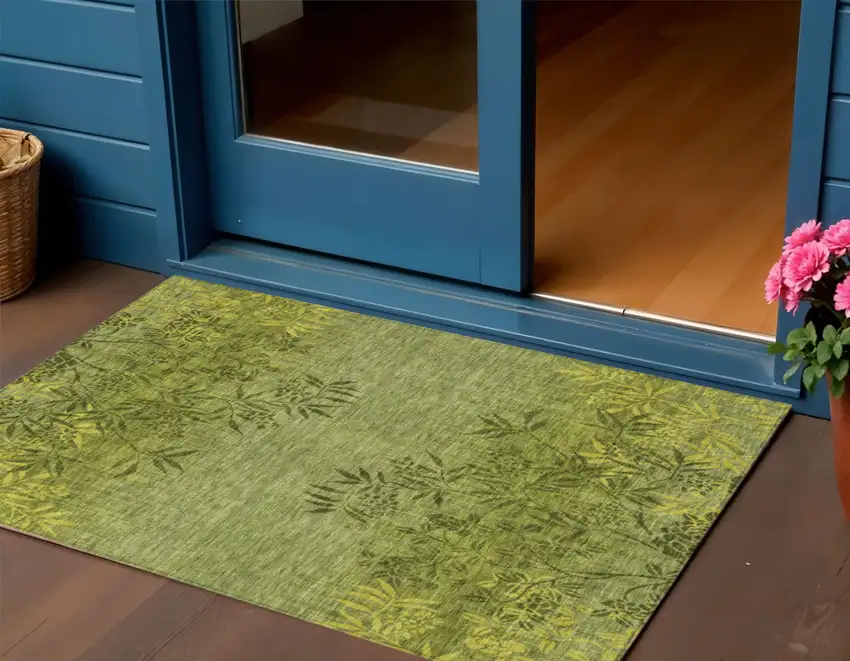 Olive Green And Fern Green Floral Washable Indoor Outdoor Area Rug