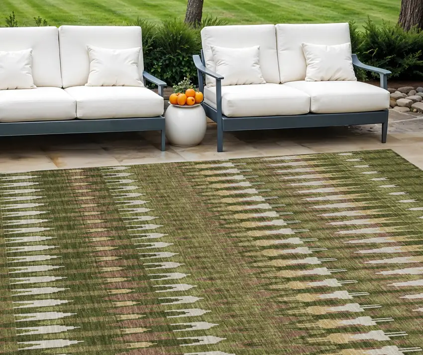 Add great coloration and comfortable texture to your space with this 8-foot x 10-foot olive green brown and gold southwestern washable indoor outdoor area rug. This rectangle shaped rug features a southwestern design that will work well both indoors or out. A classic shape marries with good looking design for your living room, hall, bedroom, porch, patio, or poolside. Ideal for outdoor spaces or high traffic areas with kids and pets, this rug is made from heavy duty polyester that is stain resistant to help repel water, dirt, and stains. Makes a great way to dress up your patio, porch, or poolside, but also works well as a durable and easy to maintain option in the kitchen, family room, or mudroom. 96-inch h x 120-inch w x 0.19-inch d.