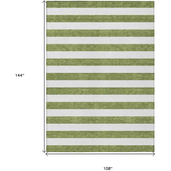 Add great coloration and comfortable texture to your space with this 9-foot x 12-foot olive green striped washable stain resistant non skid indoor outdoor area rug. This rectangle shaped rug features a striped design in olive green to give it visual interest. A classic shape marries with good looking design for your space ideal for spaces with kids and pets, this rug is stain resistant to help repel stains and spilled liquids. Area rugs help to give warmth and sense of home to your space. 108-inch H x 144-inch W x 0.19-inch D