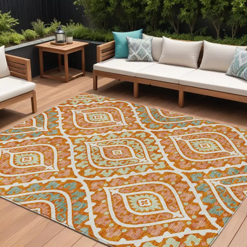 Add great coloration and comfortable texture to your space with this 8-foot x 10-foot orange peach and ivory floral washable indoor outdoor area rug. This rectangle shaped rug features a floral design that will work well both indoors or out. A classic shape marries with good looking design for your living room, hall, bedroom, porch, patio, or poolside. Ideal for outdoor spaces or high traffic areas with kids and pets, this rug is made from heavy duty polyester that is stain resistant to help repel water, dirt, and stains. Versatile in use, durable, and easy to maintain, this rug is an ideal solution to add a decorative and inviting touch to your indoor or outdoor space. 96-inch h x 120-inch w x 0.19-inch d.
