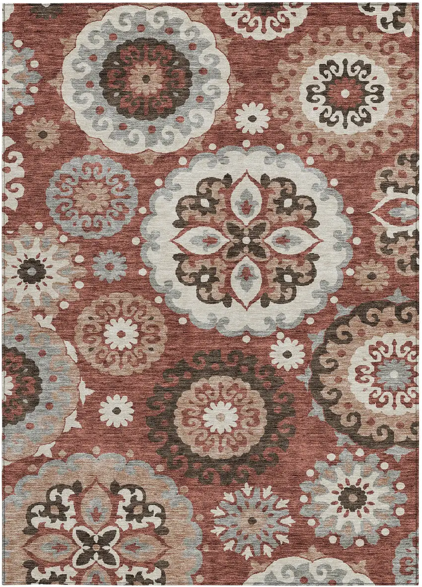 Set an inviting tone in your space with this 9-foot x 12-foot orange taupe and gray floral medallion washable indoor outdoor area rug. This rectangle shaped rug features a floral medallion design that will work well both indoors or out. A classic shape marries with good looking design for your living room, hall, bedroom, porch, patio, or poolside. Ideal for outdoor spaces or high traffic areas with kids and pets, this rug is made from heavy duty polyester that is stain resistant to help repel water, dirt, and stains. Versatile in use, durable, and easy to maintain, this rug is an ideal solution to add a decorative and inviting touch to your indoor or outdoor space. 108-inch h x 144-inch w x 0.19-inch d.
