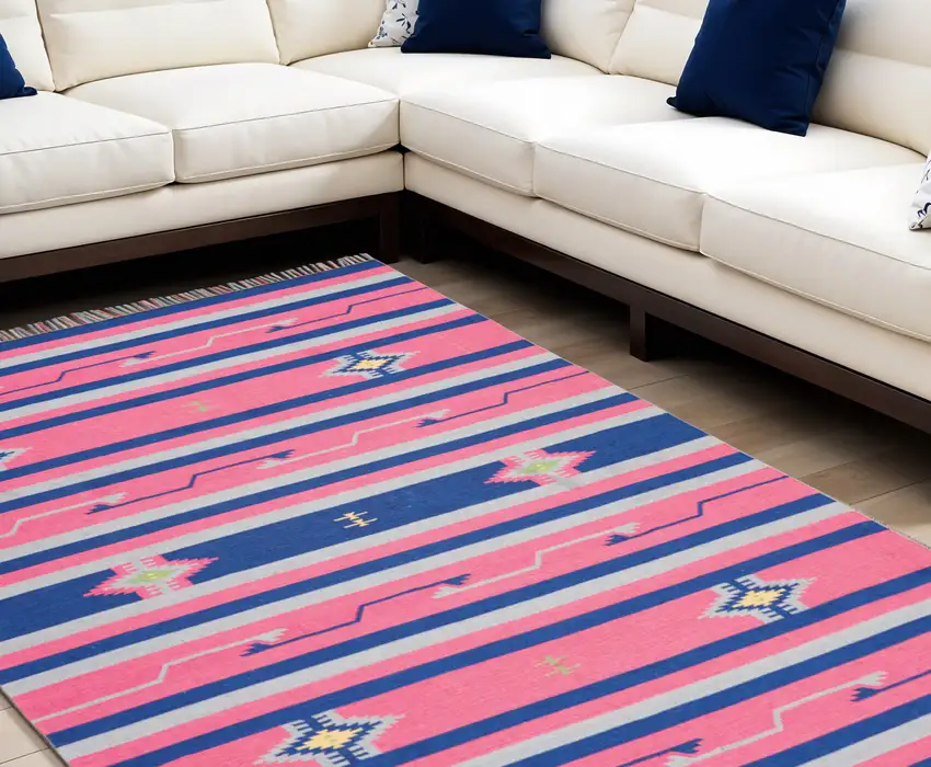Pink and Blue Southwestern Handmade Area Rug With Fringe