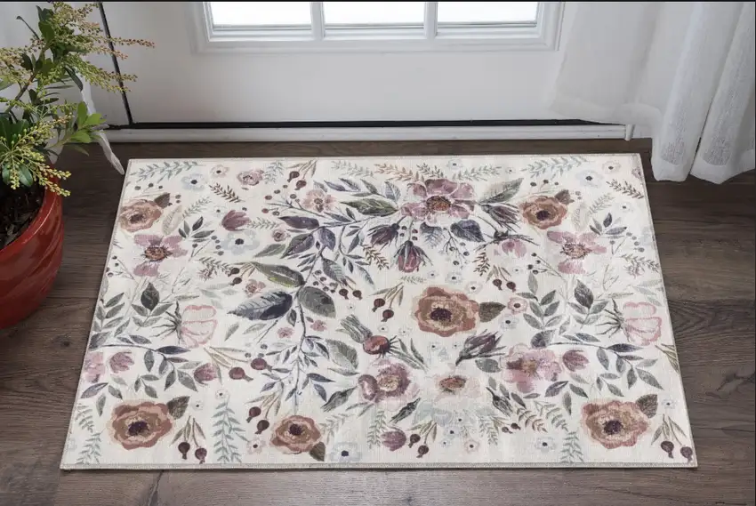 Pink and Ivory Floral Power Loom Washable Non Skid Area Rug