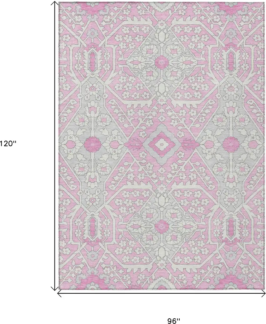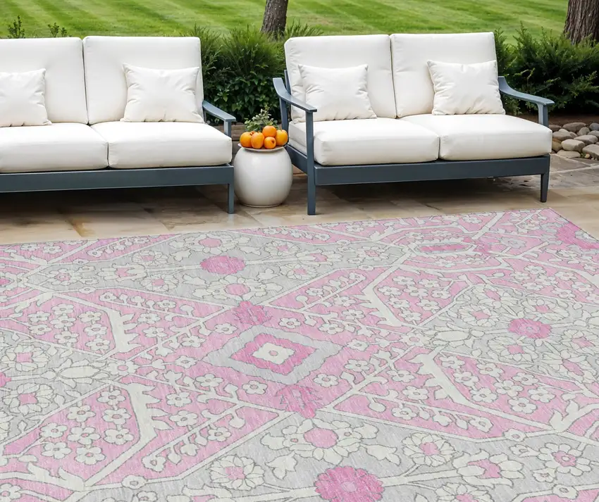 Add great coloration and comfortable texture to your space with this 8-foot x 10-foot pink ivory and gray floral washable indoor outdoor area rug. This rectangle shaped rug features a floral design that will work well both indoors or out. A classic shape marries with good looking design for your living room, hall, bedroom, porch, patio, or poolside. Ideal for outdoor spaces or high traffic areas with kids and pets, this rug is made from heavy duty polyester that is stain resistant to help repel water, dirt, and stains. Makes a great way to dress up your patio, porch, or poolside, but also works well as a durable and easy to maintain option in the kitchen, family room, or mudroom. 96-inch h x 120-inch w x 0.19-inch d.