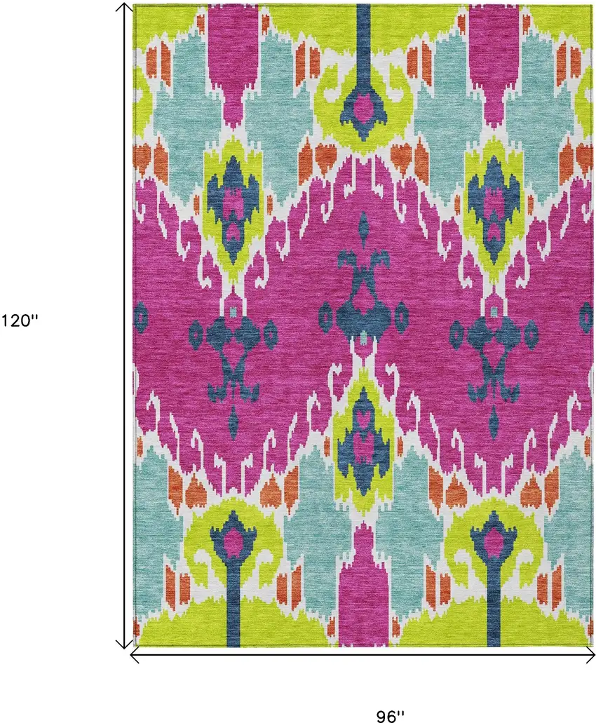 Pink Lime Green And Orange Ikat Washable Indoor Outdoor Area Rug