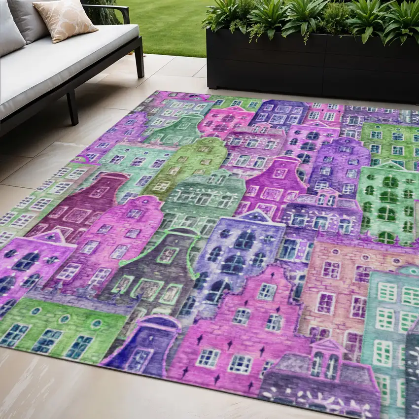 Add some artistry to your room with this 5-foot x 8-foot purple lilac and green village houses washable indoor outdoor area rug. This rectangle shaped rug features a village houses design that will work well both indoors or out. A classic shape marries with good looking design for your living room, hall, bedroom, porch, patio, or poolside. Ideal for outdoor spaces or high traffic areas with kids and pets, this rug is made from heavy duty polyester that is stain resistant to help repel water, dirt, and stains. Makes a great way to dress up your patio, porch, or poolside, but also works well as a durable and easy to maintain option in the kitchen, family room, or mudroom. 60-inch h x 90-inch w x 0.19-inch d.