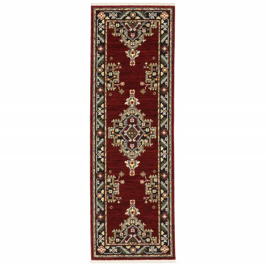 Red Black Beige And Blue Oriental Power Loom Stain Resistant Runner Rug With Fringe