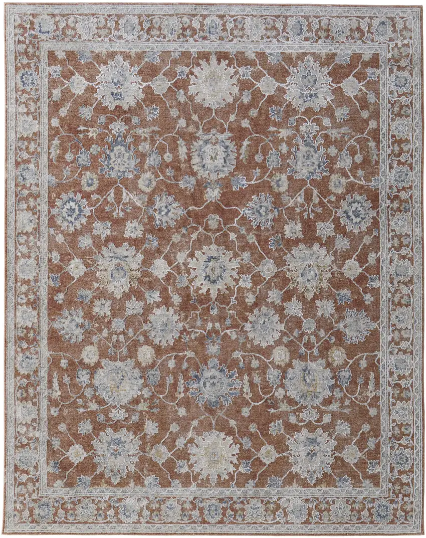 Red Blue and Ivory Floral Power Loom Worn Faded Area Rug With Fringe